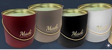 Eleganti scatole cilindriche in cartoncino microonda con plastificazione opaca. Coperchio in latta dorata, fondo rigido ad alto spessore e preziosi