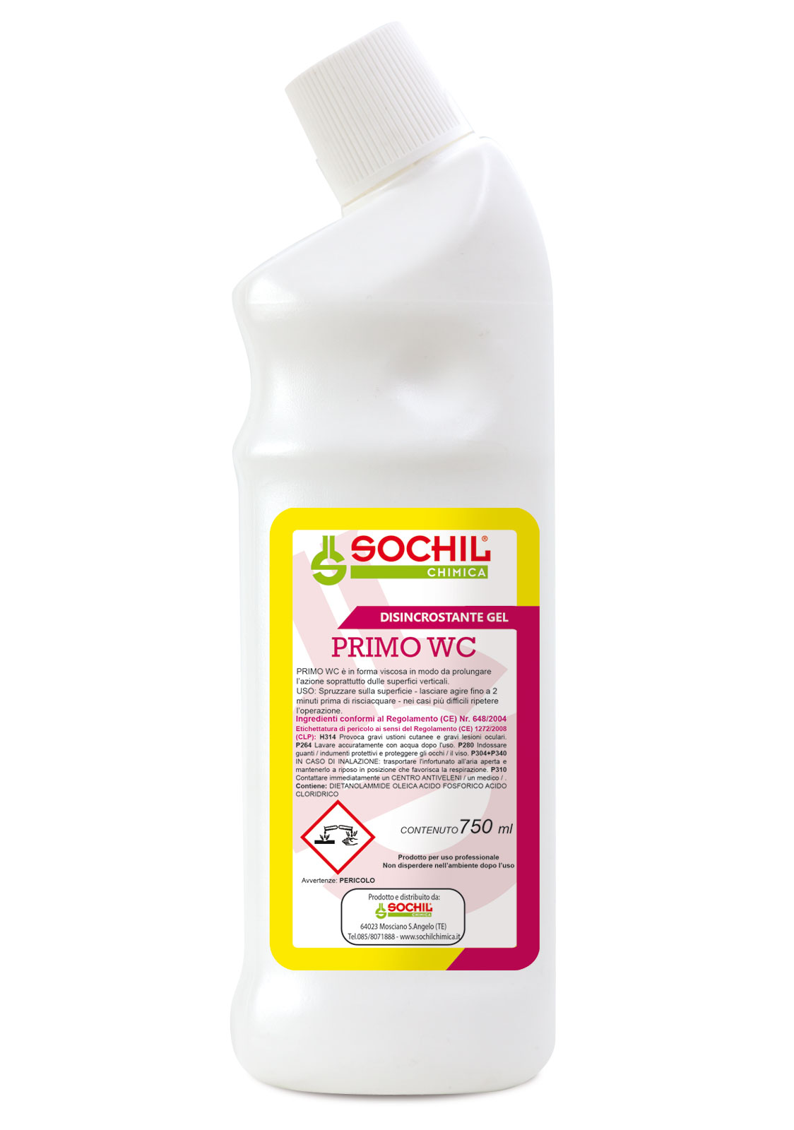 PRIMO WC è un acido disincrostante con azione detergente. PRIMO WC è indicato quando il residuo di calcare è indurito, agisce anche su macchie di ruggine. PRIMO WC ha una funzione igienica sanitaria, infatti, rimuovendo i depositi calcarei, favorisce l’eliminazione della carica batterica che vi si annida.